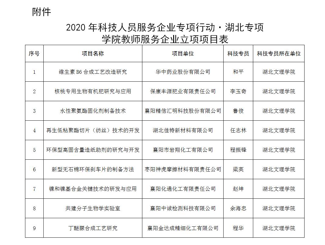 近日,省科技厅公示了2020年科技人员服务企业专项行动·湖北专项(第二批)拟立项项目清单,学院7位教师入选。在此前第一批立项项目中,学院有2位老师入选。此次科技人员服务企业专项行动·湖北专项,学校共有22位老师服务的企业获得立项支持,将获扶持资金220万元。科技人员服务企业专项行动·湖北专项是中央支持湖北的重要事项,通过搭建技术对接网络平台,打通湖北科技型中小企业技术需求与全国科技人员的对接通道。对与高校院所科研人员达成合作的项目,择优给与经费支持,切实降低科技型中小企业引才成本,助力复工复产,提升企业自主创新能力,培育一批科技型企业。