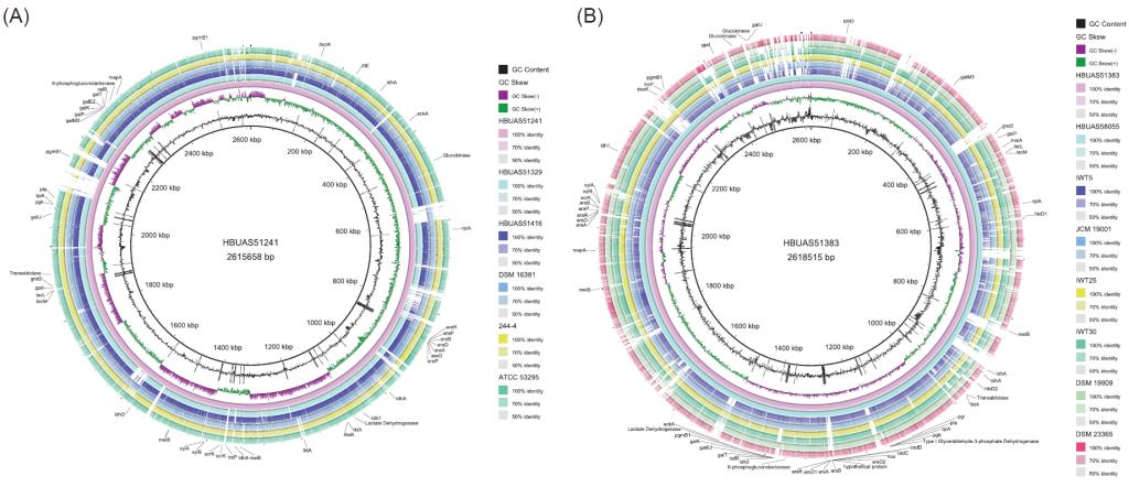 图1 Levilactobacillus tujiae HBUAS51241T(A)和Secundilactobacillus angelii HBUAS51383 T(B)新物种的基因组比较圈图