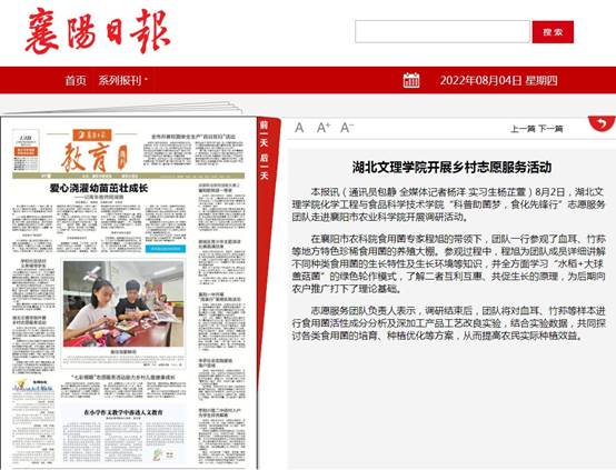 (通讯员 包静 隋哲)2022年8月4日,襄阳日报社以“湖北文理学院开展乡村志愿服务活动”为题,报道了我院“科普助菌梦,食化先锋行”志愿服务团队走进襄阳市农业科学院开展的调研活动。