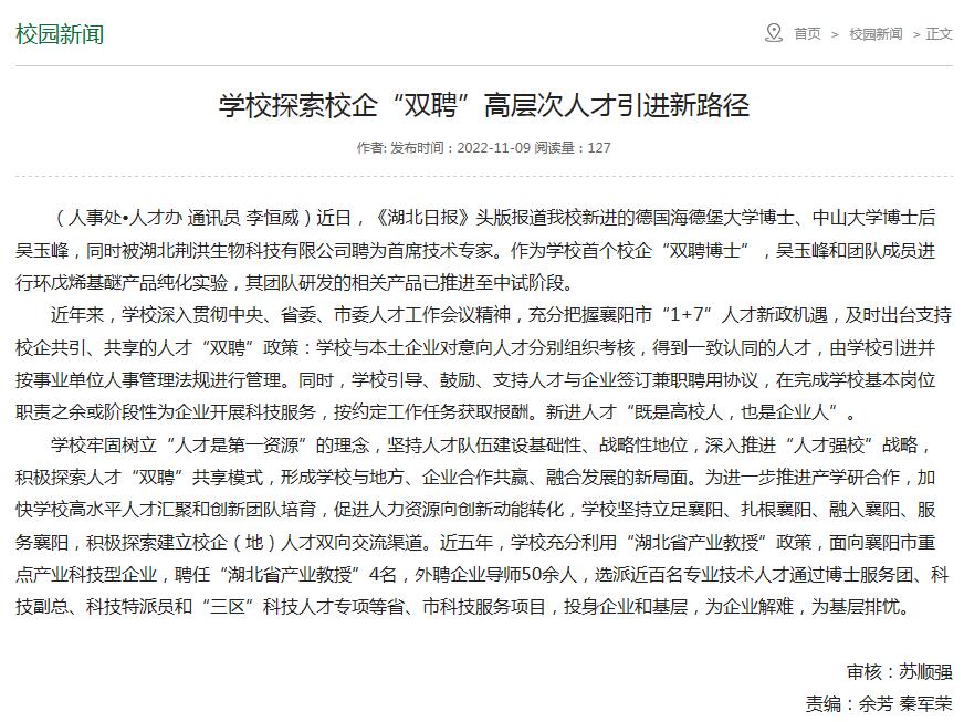 (通讯员 刘向红)日前,学校官网对我院以“双聘博士”新机制引进德国海德堡大学吴玉峰博士进行了报道。“既是高校人,也是企业人”,这是学校推进“人才强校”的最新举措,也是学院破解校企合作深层次合作瓶颈、主动服务地方经济发展的有益尝试,实现了校企双赢:既锻炼和培养了具有工程背景的双师型教师,又切实解决了企业高层次技术人才难以引进的困局。
