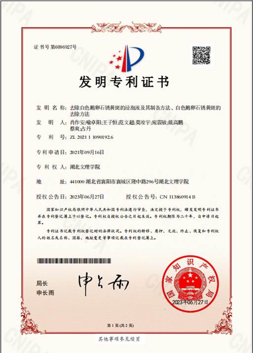 (通讯员 潘梅笑)日前,肖作安副教授的“去除白色鹅卵石锈黄斑的浸泡液及其制备方法、白色鹅卵石锈黄斑的去除方法”成果喜获国家发明专利授权(ZL202111090192.6)。