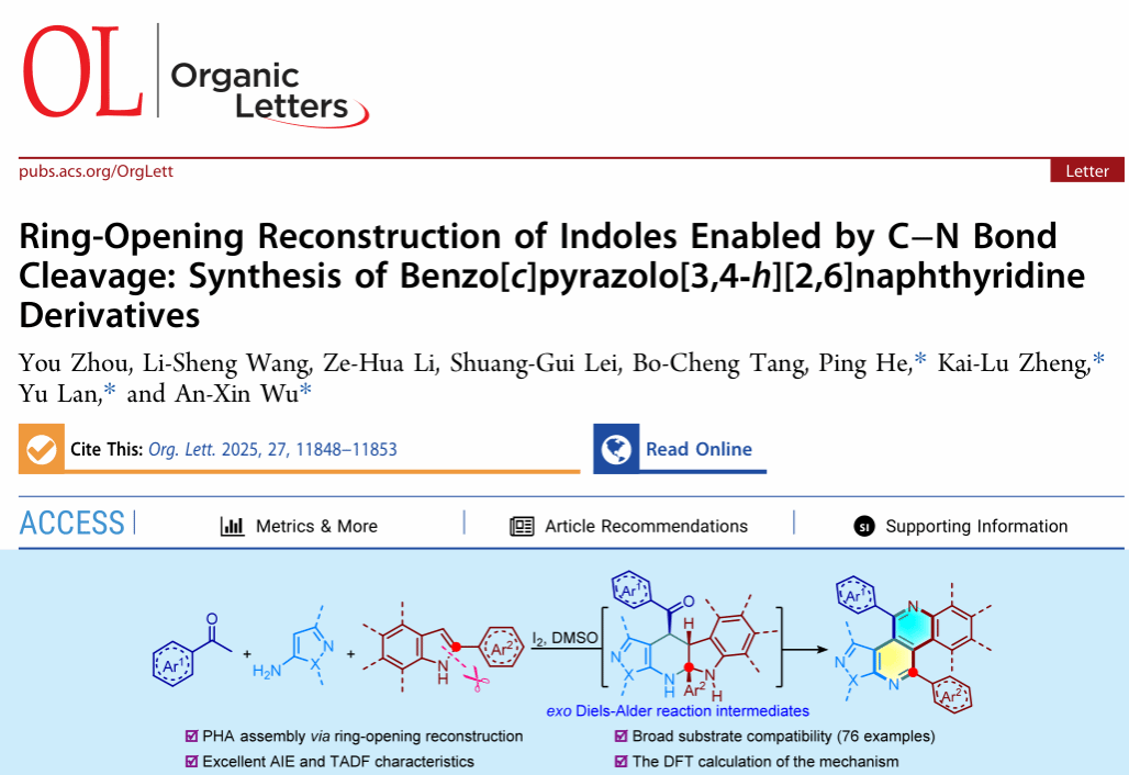 (通讯员 任志林)近日,x-mol资讯(https://www.x-mol.com/news/934527)对我院有机化学功能分子智造与应用团队周游博士的最新研究成果(Org. Lett., 2025, 27, 11848−11853. DOI: 10.1021/acs.orglett.5c03710.)进行了关注推送。论文题目为“Ring-Opening Reconstruction of Indoles Enabled by C−N Bond Cleavage: Synthesis of Benzo[c]pyrazolo[3,4‑h][2,6]naphthyridine Derivatives”(基于吲哚C−N键裂解的开环重构策略:高效构建苯并萘啶衍生物)。周游博士为论文第一作者,湖北文理学院为论文第一通讯单位。Organic Letters是American Chemical Society(美国化学会)出版社1999年起发行的国际期刊,主要报道有机化学方面的最新研究进展,是中科院双一区top期刊、自然指数(Nature Index)期刊,学校期刊评级为A2级,最新影响因子为5.0。