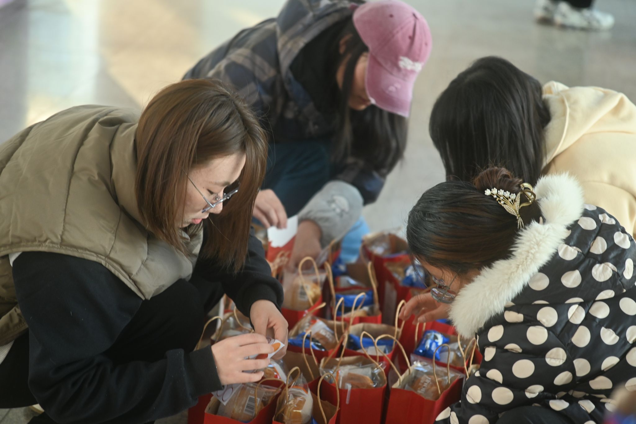 与此同时,学院积极动员部分教师代表与学生志愿者,共同投身于“加油包”的筹备工作。师生们充分利用课余时间,以高度负责的态度精心挑选并分装各类既实用又寓意美好的物品,其中有寓意“面包会有的,牛奶会有的,一切都会有的”的面包与牛奶,有祝愿“下笔如有神”“纵享丝滑”的文具与巧克力,还有暖贴等防护保暖用品。每一份“加油包”均经过细致搭配,既充分考量了备考的实际需求,更凝聚着全院师生对考研同学的深切关爱与有力鼓励。筹备现场洋溢着温馨和谐的氛围,师生们欢声笑语,携手为即将奔赴考场的学子们构筑起一道坚不可摧的后援屏障。