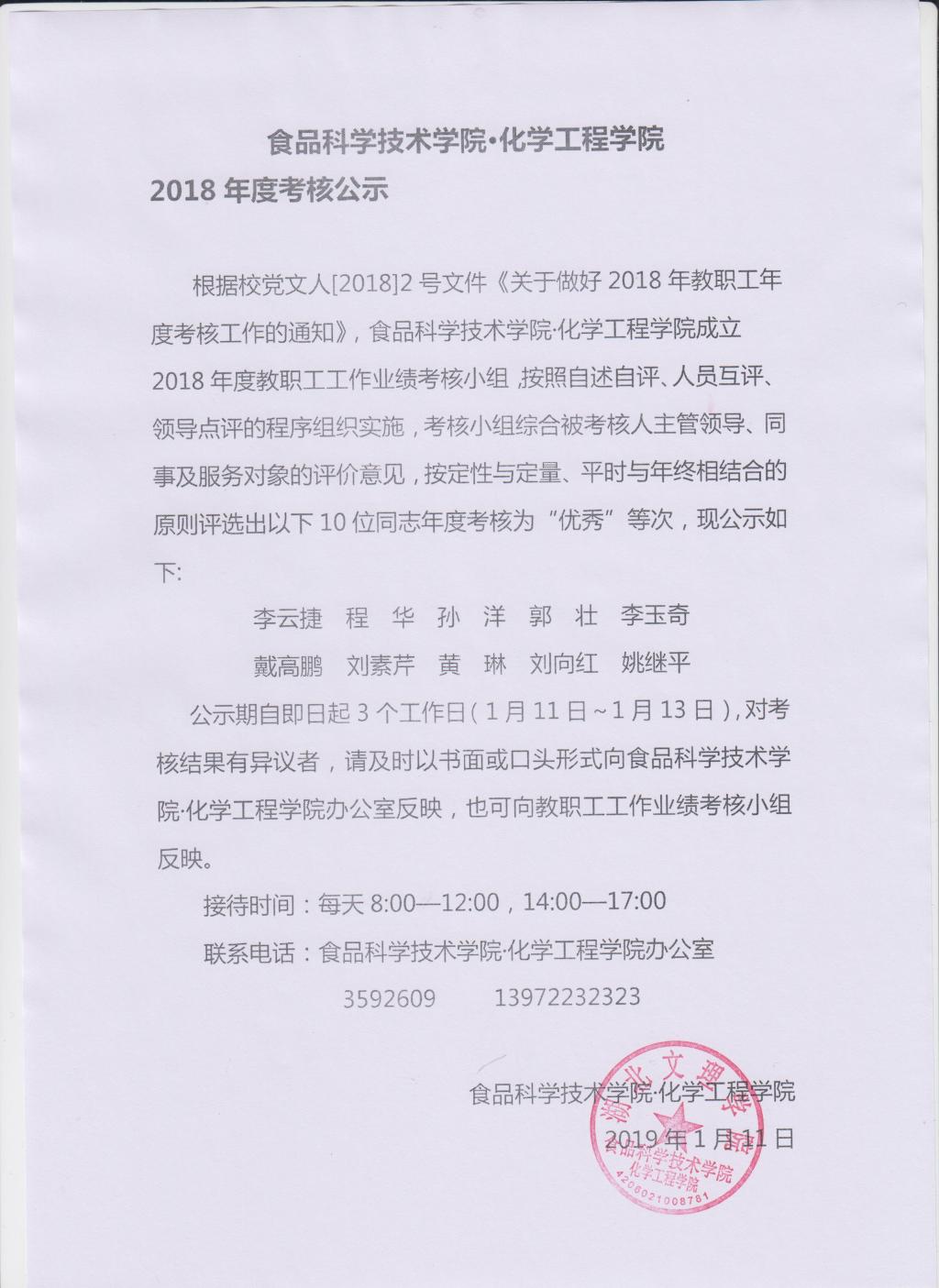 食品科学技术学院•化学工程学院2018年度考核公示