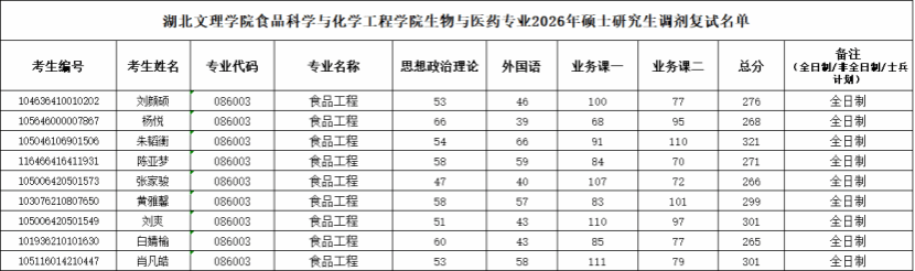 湖北文理学院2026年生物与医药专业硕士研究生调剂复试名单