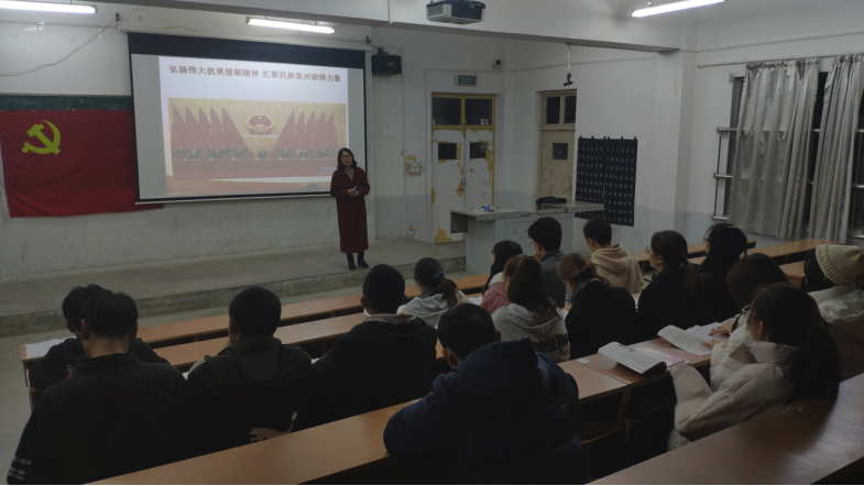 (通讯员 张帅军)11月20日晚,食品·化学学院学生党支部于N6阶梯04教室开展党课第四讲——弘扬伟大抗美援朝精神,汇聚民族复兴磅礴力量,马克思主义学院副教授熊明秀主讲。