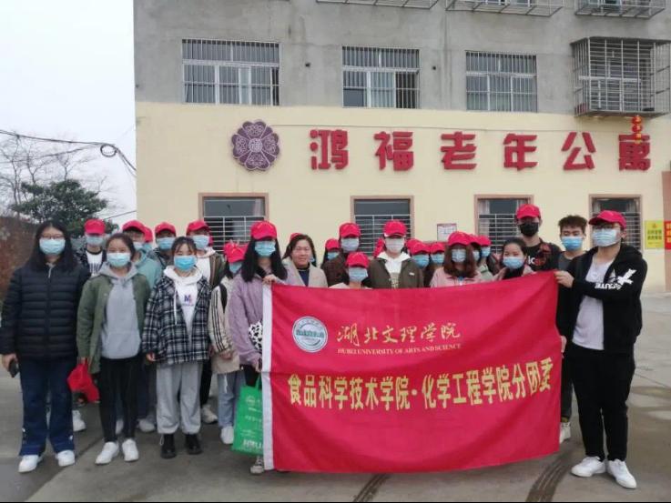 (食品•化工学院 通讯员 包静)阳春三月,春意盎然。为践行雷锋精神,弘扬尊老、爱老、敬老、助老的中华民族传统美德,加强当代大学生思想品德教育,增强大学生的社会责任感。3月16日上午9点,院学工办主任姚继平、团委书记包静带领我院30余名志愿者在襄阳市凤凰村鸿福养老公寓开展了以“送温暖 献爱心 关爱老人从我做起”为主题的志愿服务活动。