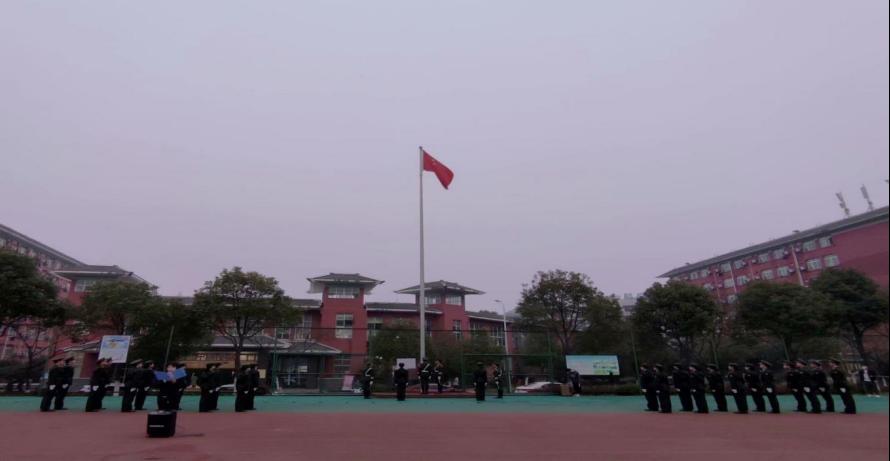 升旗仪式于7:00准时开始,国旗护卫队的升旗手们以饱满的热情护卫着鲜艳的五星红旗入场。随后,伴随《义勇军进行曲》响起,全体师生行注目礼,五星红旗冉冉升起,迎风飘扬。