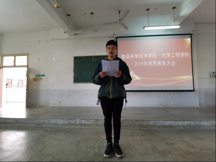 (食品·化工学院 通讯员 张婷) 12月26日下午,食品科学技术学院•化学工程学院举行“2019年感恩教育大会”。参加本次会议的有食化学院党委书记杨豪良、党委副书记刘向东、院学工办主任姚继平、院团委书记刘双圆以及全获得院助学金学生100余人。