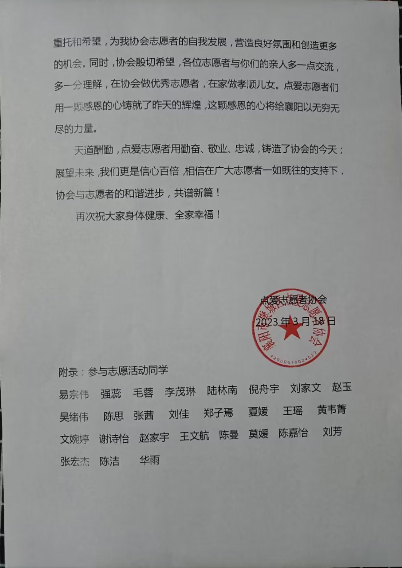 (食品·化工学院 通讯员 向琼 丁知画) 近日,襄阳市樊城区点爱志愿者协会向我院食品2212班27名同学发来感谢信。信中赞扬以易宗伟同学为代表的27名食化学子在景区、社区打扫和爱心义务售卖活动中的突出表现,用切身言行诠释了“奉献、友爱、互助、进步”的志愿者服务精神,彰显了新时代大学生的责任与担当。