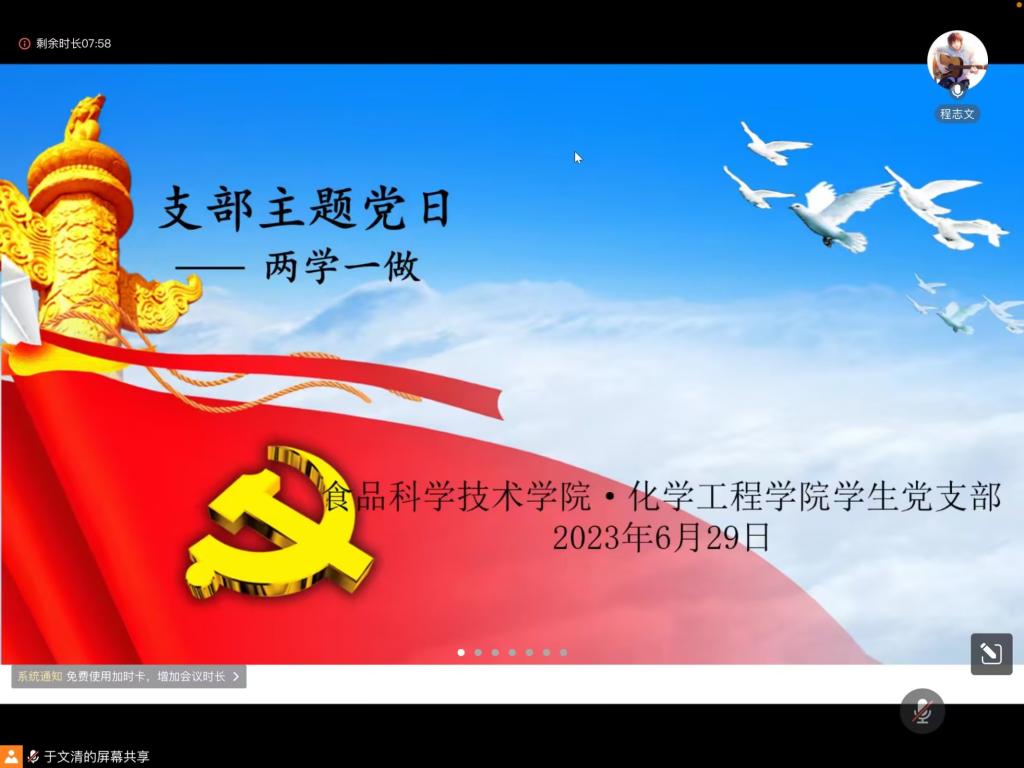 (食品·化工学院 通讯员 沈苗苗)6月29日晚上7点,食品化工学院学生党支部于线上开展六月份学习大会,学工办主任包静和学生党支部全体成员参加会议。