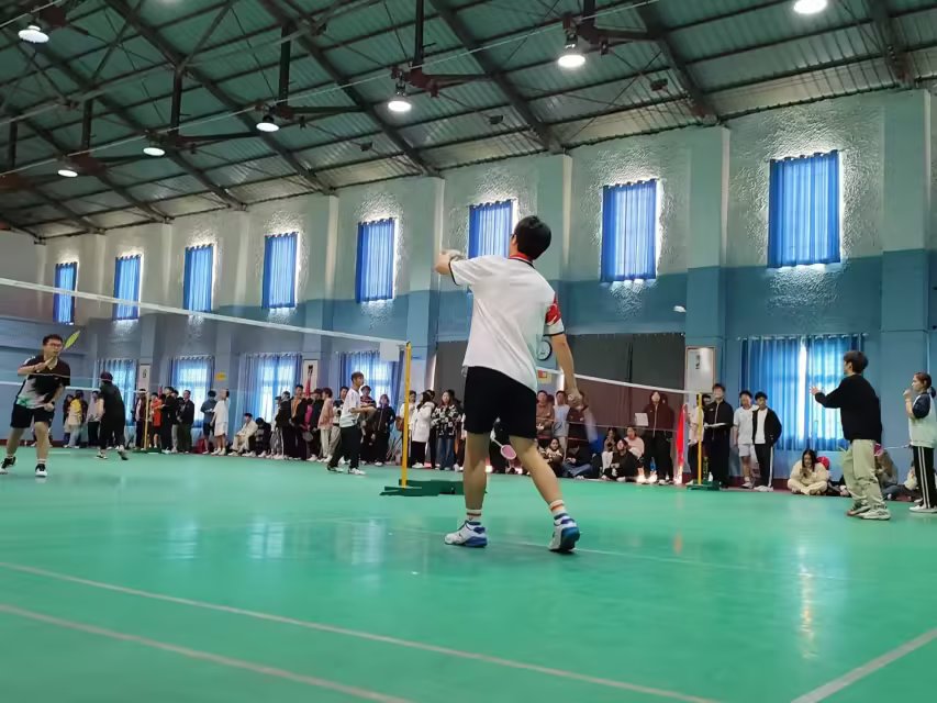 赛场上,食化学院22级朱吕江作为男单代表最先上场,以精准的控球,再拉吊之间衔接刁钻的扣杀以31-26的比分领先一局。接下来男双选手梁海城,徐志祥与资环学院开展了激烈的比赛,最终以31-22的成绩取得胜利。团体赛面对着两胜两负的状态,起决定性的混双登场,何勇与余思琴相互配合,面对落后毫不退缩,将比分打到30-30后,何勇接起杀球,将球斜线抽出,以一分之差获得了混双的胜利,拿下了第一局比赛,赢得了在场人的声声喝彩,激发了大家对运动项目的热情,展现出了食化学子奋发拼搏的勇气和勇于进取的精神面貌。