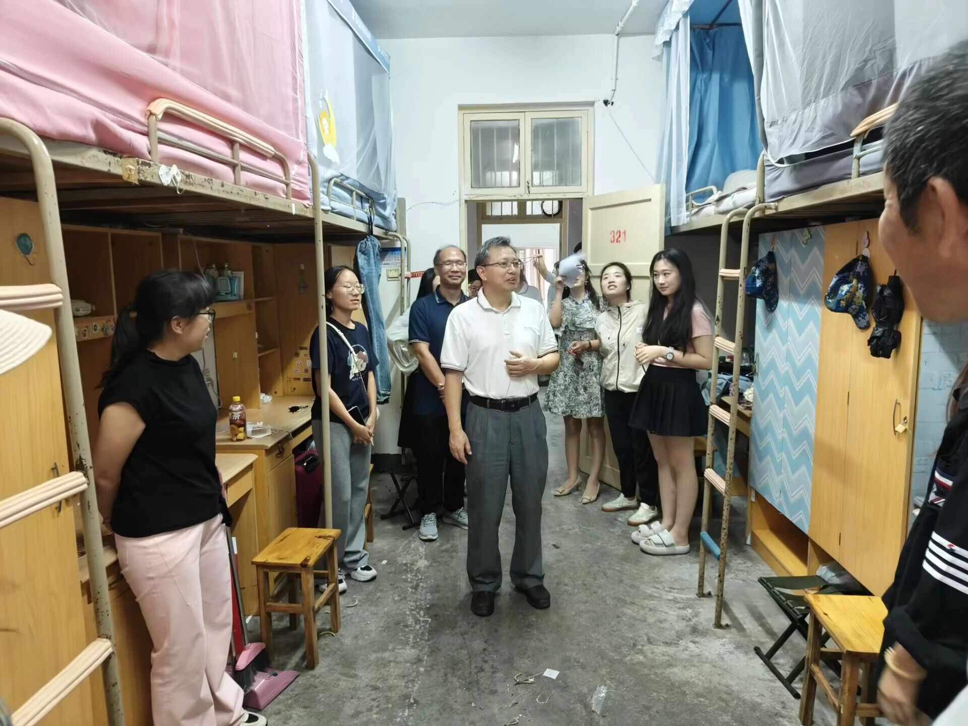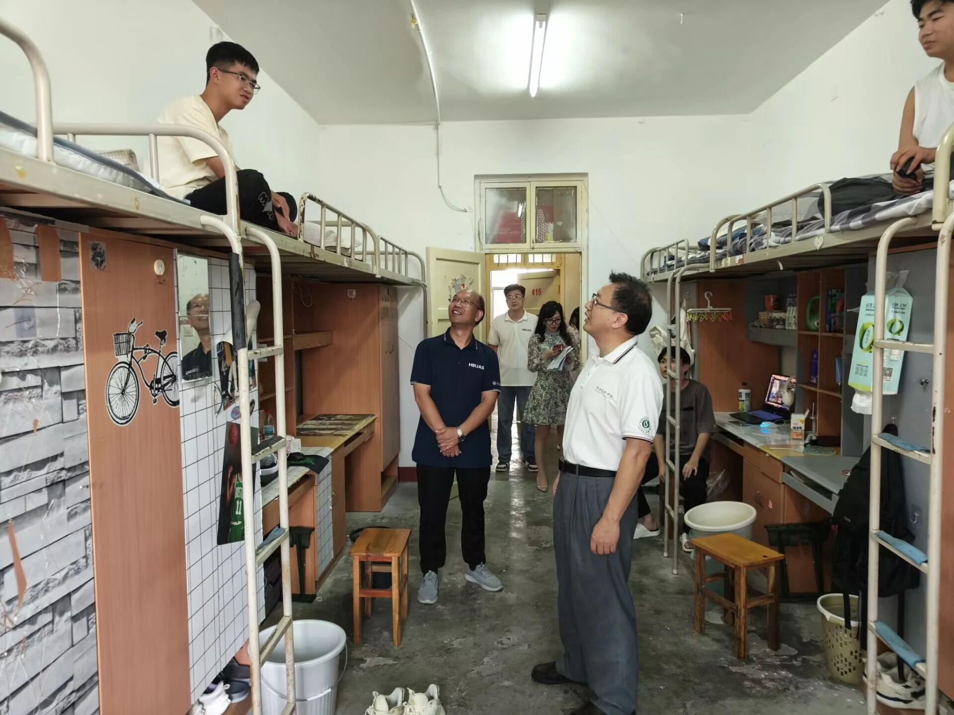 (通讯员 向琼)为迎接到来的新生,进一步了解学生生活情况及宿舍卫生状况。9月13日,学院党委书记储杰、党委副书记刘志新带领学院学工处全体辅导员及部分学生干部走访新生宿舍。