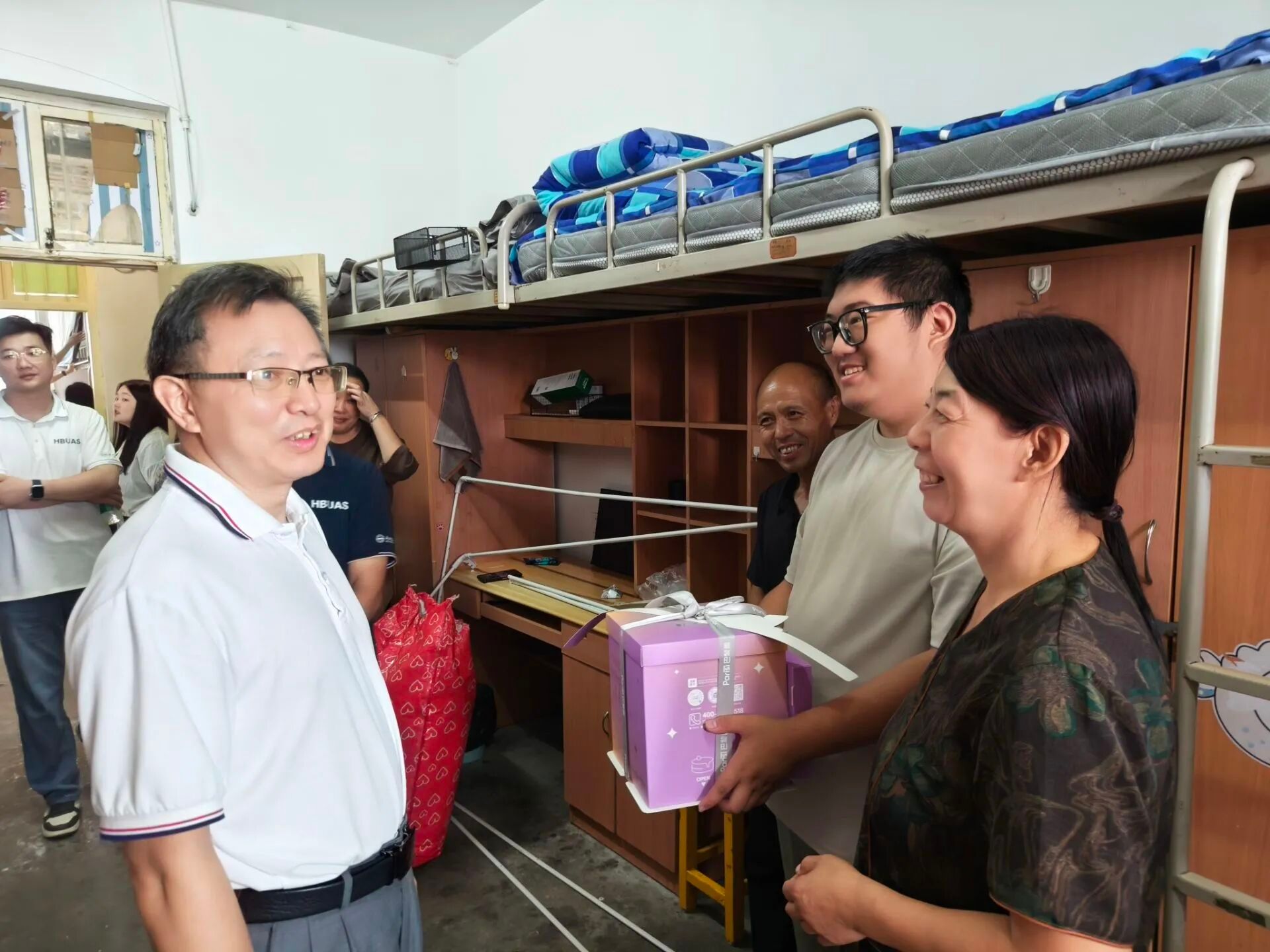 走访过程中,储杰、刘志新仔细检查了宿舍的设施设备,卫生状况以及生活条件。储杰还要求同学们加强寝室清洁管理,保持宿舍环境卫生,展现食化学院的纪律与风采。 在宿舍走访过程中,两位书记就大一新生提出的各种问题进行了详尽的解答,同2025级新生进行亲切交谈,询问同学们的家乡家庭情况、对专业的了解程度等,鼓励大家以积极的心态和良好的面貌去面对大学校园生活,勉励大家学好专业技能、加快角色转变、早日熟悉校园,提出宝贵建议,告诉同学们要劳逸结合,关注身体健康与心理健康。提醒同学们在平常生活中务必注意财产安全、用电安全和人身安全,谨防诈骗。走访当天正好是一位新生的生日,学院领导亲手为这位学生送上生日蛋糕并为其送上学院诚挚的祝福,让其体会到了属于食化大家庭的一份温暖。